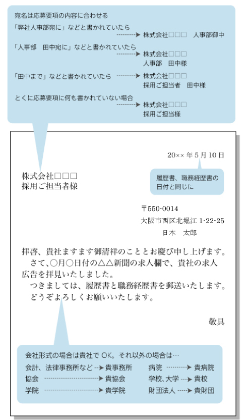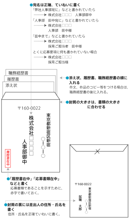 新聞などの社員募集記事には「株式会社 △△△ 人事部宛に書類をお送りください」などと書かれています。この場合、宛名は「株式会社△△△ 人事部御中」とします。くれぐれも「~人事部」で終わらせないようにします。